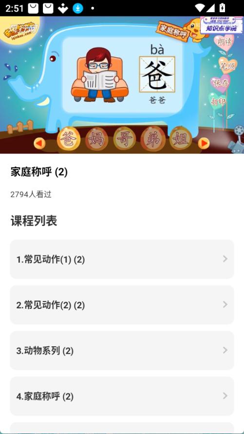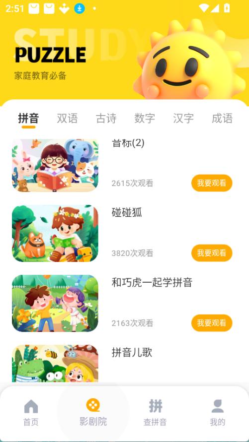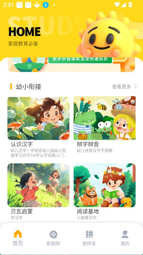 3. 进入主课程或影剧院模块,挑选拼音、字母、古诗等课程开始学习。