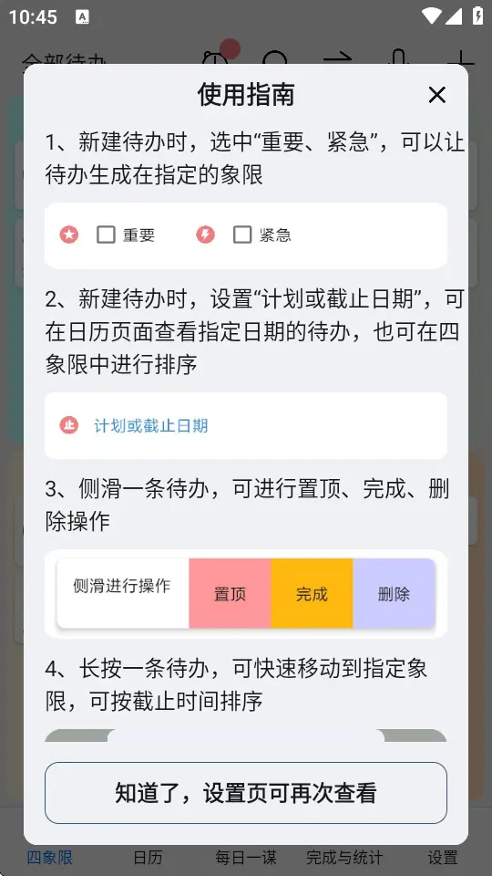 待办四象限是一款基于艾森豪威尔矩阵原理设计的时间管理工具,帮助用户将日常任务划分为“重要且紧急”、“重要不紧急”、“紧急不重要”和“不紧急不重要”四个象限,实现事务的可视化分类与优先级排序。通过科学的时间规划方式,用户可以更高效地安排工作与生活,提升学习和工作效率。软件支持任务提醒和专注执行模式,在专注模式下可减少干扰,帮助用户集中精力完成当前任务。