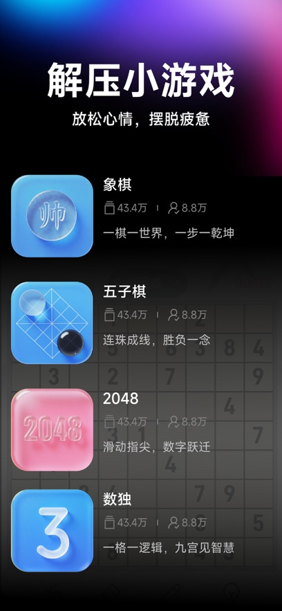 2. 新增“数独”“五子棋”两款益智小游戏;