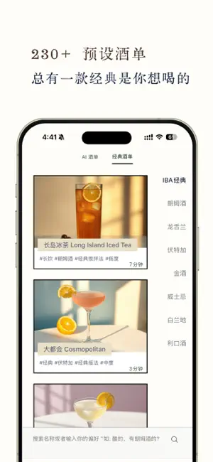 v1.0 首次上线版本,内置230+精选酒单,涵盖100+ IBA经典款式与130+创意特调;新增AI对话调酒功能,实现情绪驱动式酒单生成;优化原料库存管理模块,修复拍照识别导致的闪退问题,提升整体稳定性与用户体验。