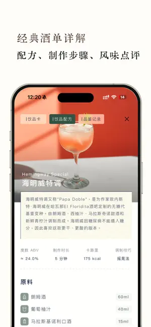 - 点击任意酒单进入饮品卡页面,查看详细配方、制作方法及品鉴建议。