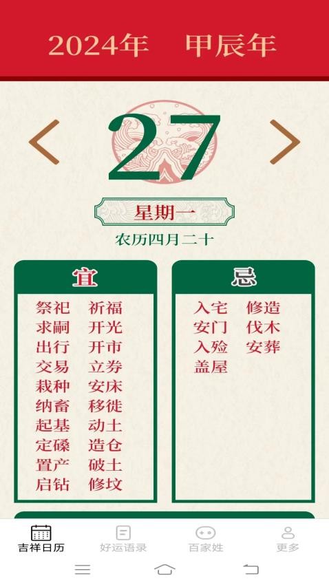 吉祥如意来是一款以农历日历为核心的传统文化查询软件,集传统节日、节气信息、每日宜忌查询于一体,帮助用户科学安排生活与事务。软件还内置丰富的励志格言与经典语录,涵盖好运、祝福、健康、早安等多种主题,为用户带来每日心灵激励。同时,应用建有完整的百家姓数据库,支持查询姓氏起源、文化内涵及姓氏排名,助力用户深入了解家族背景与传统文化。