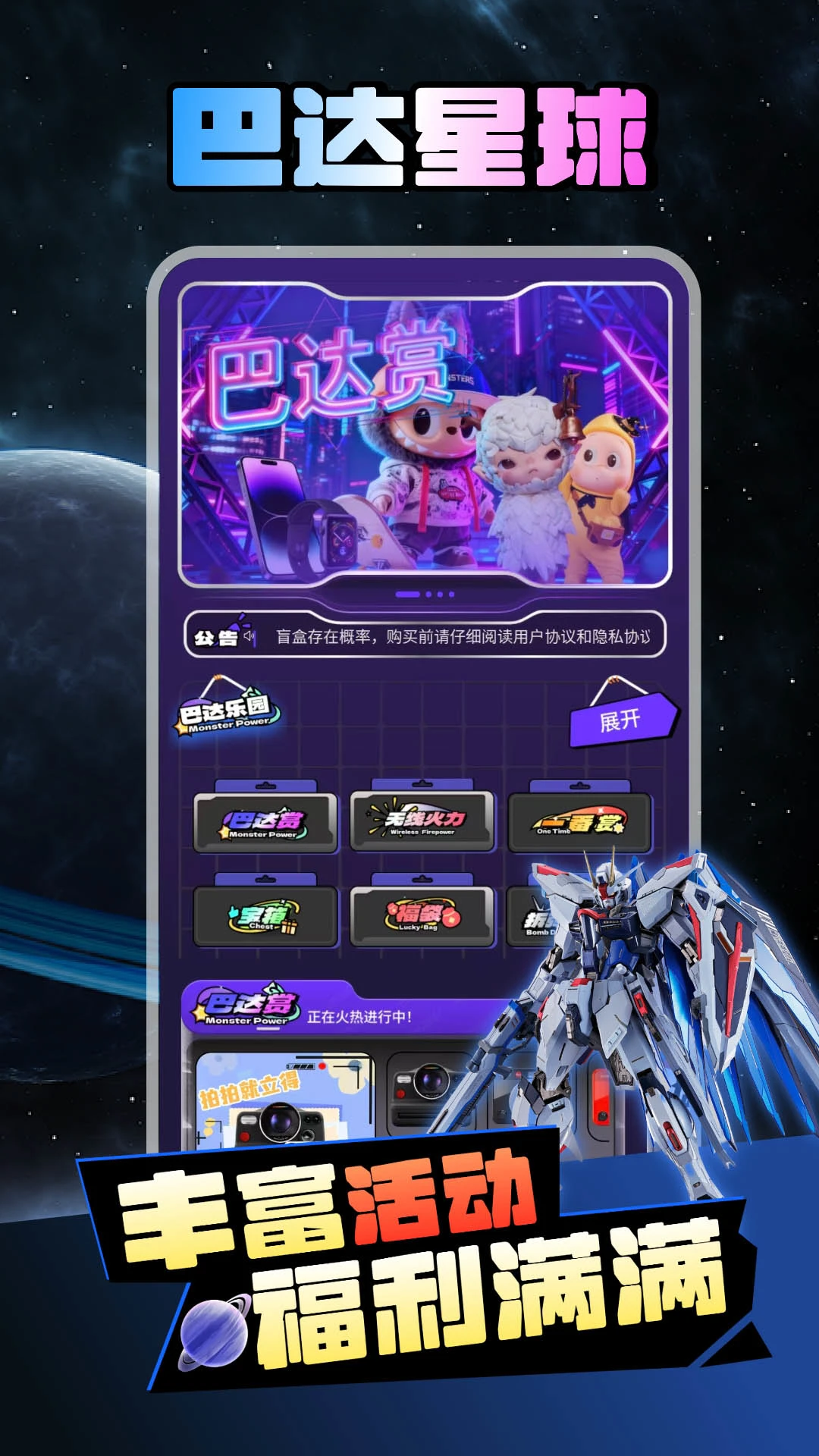 巴达星球app是一款引领全球时尚潮流的线上潮玩盲盒电商平台,致力于为用户提供丰富多样的潮流商品。平台汇聚了来自海内外热门动漫、知名IP及各大品牌的精选好物,涵盖“拉布布”系列公仔、动漫手办、卡牌收藏、3C数码产品等潮流单品。用户每天登录即可获得免费抽奖机会,享受开盲盒的乐趣,正品保障让购物更安心。