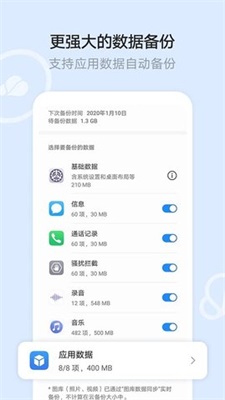 1.机中的数据将自动备份在云端,随时待命。重要内容自动整体备份,数据安全无忧。
