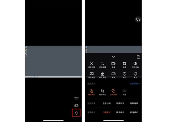 4、进入到远控桌面后,可以通过远控工具栏进行一些列的远程操作,点击远控界面右下角【<>】图标打开远控工具栏