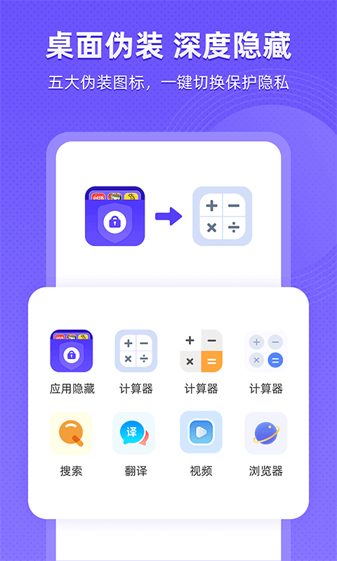 应用隐藏计算器无广告是一款非常强大的隐藏图标软件,该软件可以帮助用户在这里进行隐藏和替换各种各样的软件图标。这样就可以全方位的保护好自己的隐私,操作的方式都非常的简单,无论是游戏还是不同的应用,都可以免费进行隐藏。用户可以设置相关的密码以及各种各样的内容,直接就可以进入到隐藏空间之中,可以在这里隐藏自己比较重要的相关照片。