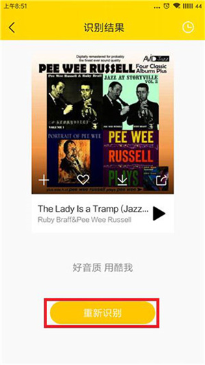 6、听歌识曲在唱歌的时候一定要在安静的环境中,而且要对准麦克风的位置唱歌,这样识别的结果更准确,识别后会出现识别结果,当然,识别的过程很可能是错的,这时点击【重新识别】再识别一次。