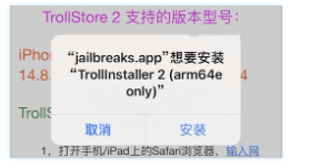 4、打开 GTA Car Tracker 后点击 install TrollStore 会跳出正在安装的提示,(如果出现报错Error可以参考文章后面解决方法)等待菊花重启后回到手机屏幕上就可以看到又多出来一个 TrollStore 的APP;