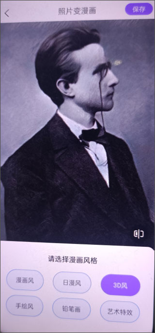 2、在相册中选择一张照片,然后选择。。的风格,弄好之后点击右上角的保存按钮即可。