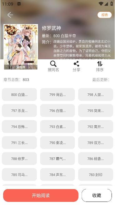 5. 在阅读界面支持章节跳转、正序倒序切换、分享与同名搜索等功能。