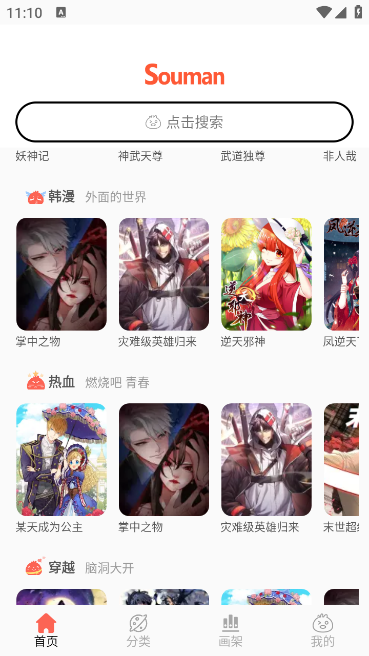 1. 打开搜漫App,首页展示韩漫、热血、穿越等多种分类及推荐内容。