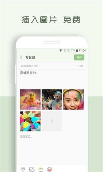 3. 在编辑页面中可添加文字、插入最多九张图片,并选择当天的天气和心情状态。