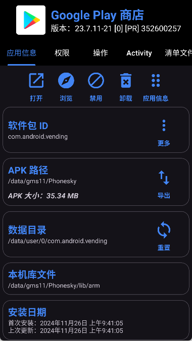 4. 查看该应用的详细信息,包括权限列表和运行日志。