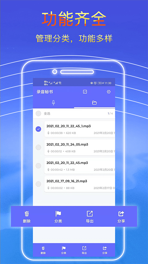 5. 进入“录音管理”界面,对文件进行重命名、分类或导出。