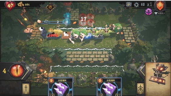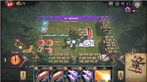 4、正式开始后怪物会从红色区域出现,并前往蓝色区域,当角色进入陷阱范围会后陷阱会自动进行攻击,消灭敌人可以获得魔眼来使用新的卡牌。