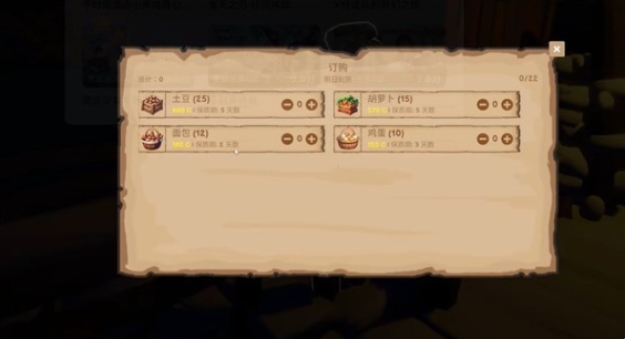 4、接来下去订货,看到大货船,穿过海上的独木桥,然后就开始订货了,可以选土豆,胡萝卜,鸡蛋,面包订货,可以每一样购买两箱。