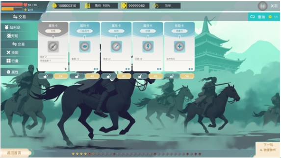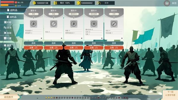 4、当消灭所有敌人后就可以通关,通过会获得不同的战利品,这些战利品是各种属性牌,点击这些属性牌会增加武将的属性。