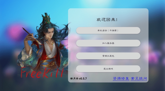 启动新月杀后,界面中有四个按钮:单机启动、加入服务器、管理拓展包、退出。