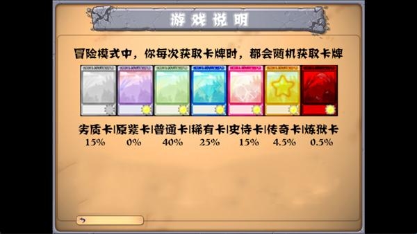 1、游戏中的所有植物都将通过抽卡来获得,每次通关都会随机获得一张卡牌来挑战下一关。