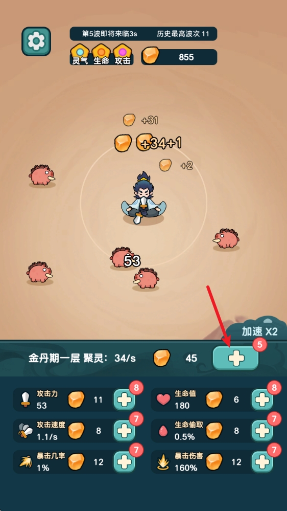 2、通过局内修炼不断提升修为,来增加自己的各项属性,抵御更多波次的敌人。