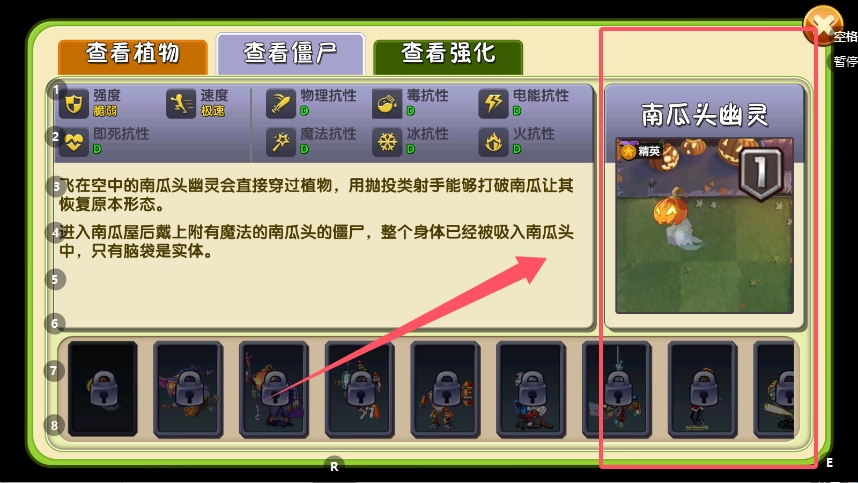 1、在游戏主界面点击进入“图鉴”系统,页面顶部会有“查看植物”、“查看僵尸”和“查看强化”三个选项卡。选择“查看强化”标签后,便能浏览所有可用的游戏内强化道具。