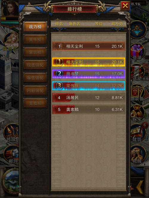 打开排行榜可以查看当前榜单内排名前100的玩家的昵称、等级、战力、军团、坐标、繁荣度等基本信息,每屏显示10人,点击显示后10个可以显示后面10人。同时还看到自己的数值信息和排名状况,如果未进入前100,则显示未进入排名。排名前三的角色名字分别显示为黄、紫、蓝色。另外提醒已经金榜题名的玩家,要时刻注意自己和前面玩家的差距以及身后的玩家和自己的差距。保持领先地位并追赶前面玩家,明确自己的定位与追求,有目的、合理的投入并分配游戏资源。对于战斗力高的玩家来说,发展的速度是非常快的。