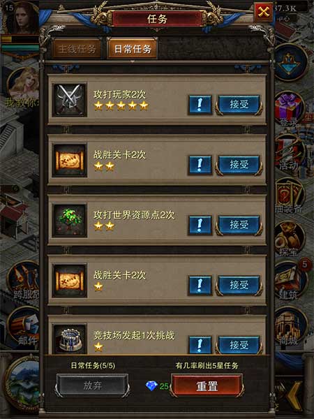 3、日常任务共有1星-5星五个等级,星级越高任务奖励也就越高。主要奖励为经验、声望、技能书。任务大都十分简单,每天可以免费完成五次,超出五次后需花费钻石重置任务并增加五次任务机会。另外做任务前不要忘记先领取任务。