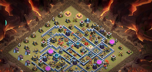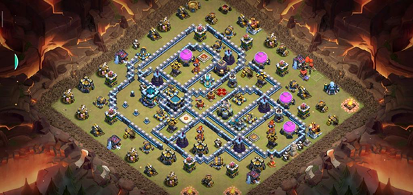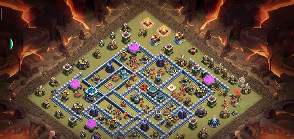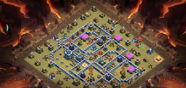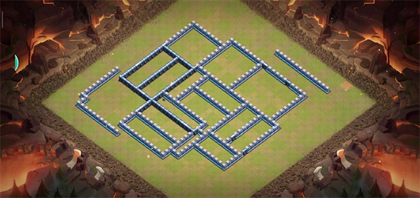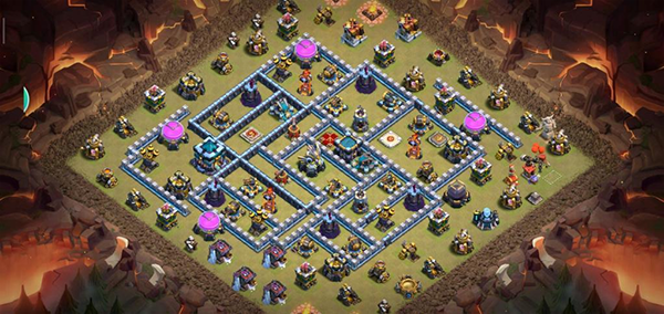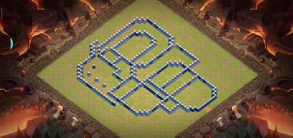 阵型解析:这是一个大本偏置的不规则格子阵,呈菱形的放置方法,大本与中心区域隔开放置。这种格局是一种比较常见的防守放置,对于陆军来说是需要弹跳或者地震才能穿透这个阵型的。火塔处均分散开,其中埋5电塔防止清边和引导部队走偏,也可以坑人。实测非常好用,适用于一般的部落战。