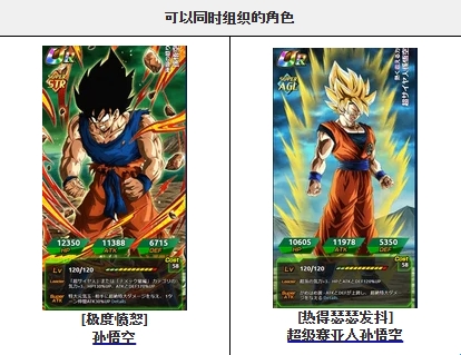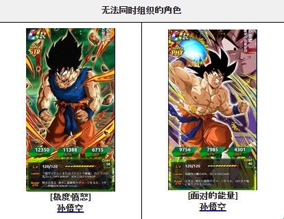 1、游戏中,如果战斗卡牌的名字相同,那么就不能够同时组队,例如下图中的两种状态下的孙悟空。