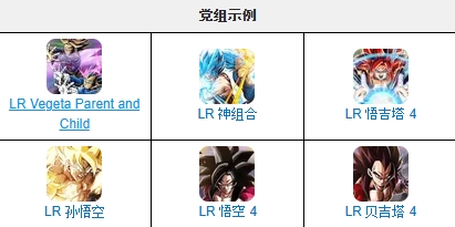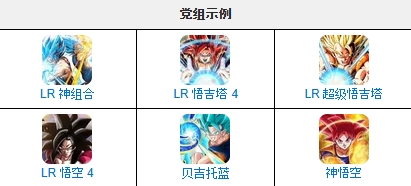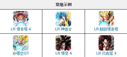 1、队伍一:LR贝吉塔和特兰克斯、LR神组合、LR悟吉塔4、LR孙悟空、LR悟空4、LR贝吉塔4