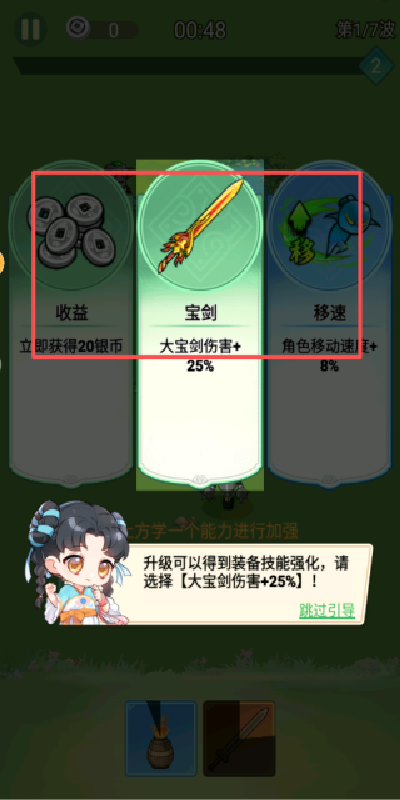 2、在战斗的过程中,我们客户以选择属性的升级,比如可以解锁大宝剑的武器。