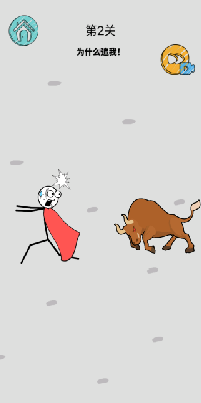 3、第二关你被水牛攻击,要利用橡皮擦擦掉身上的红色披风就能过关。