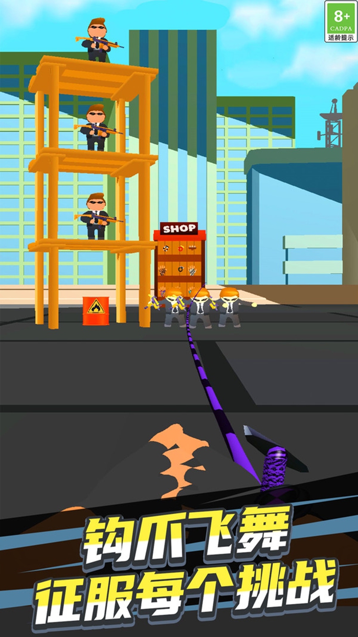 1、玩家通过拖拽操作控制绳索摆动,点击屏幕固定锚点,松手释放绳索攻击敌人,精准命中可一击制胜。