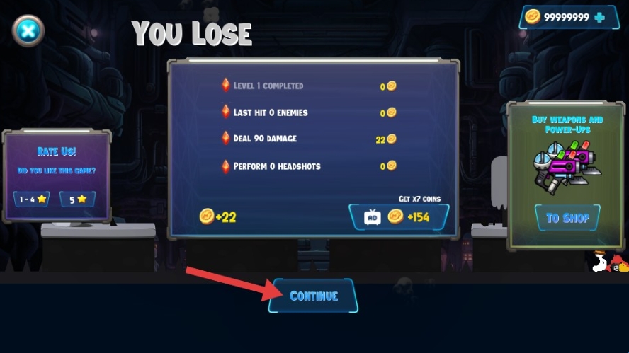 4、战斗失败后点击【Continue】继续游戏,再次挑战关卡。