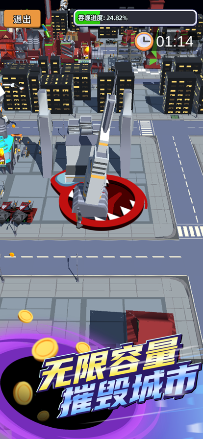 2、在游戏中,周围满是各种有趣的物品,从微小的石子到巨大的建筑,黑洞贪婪地吸收着一切,积分不断攀升。