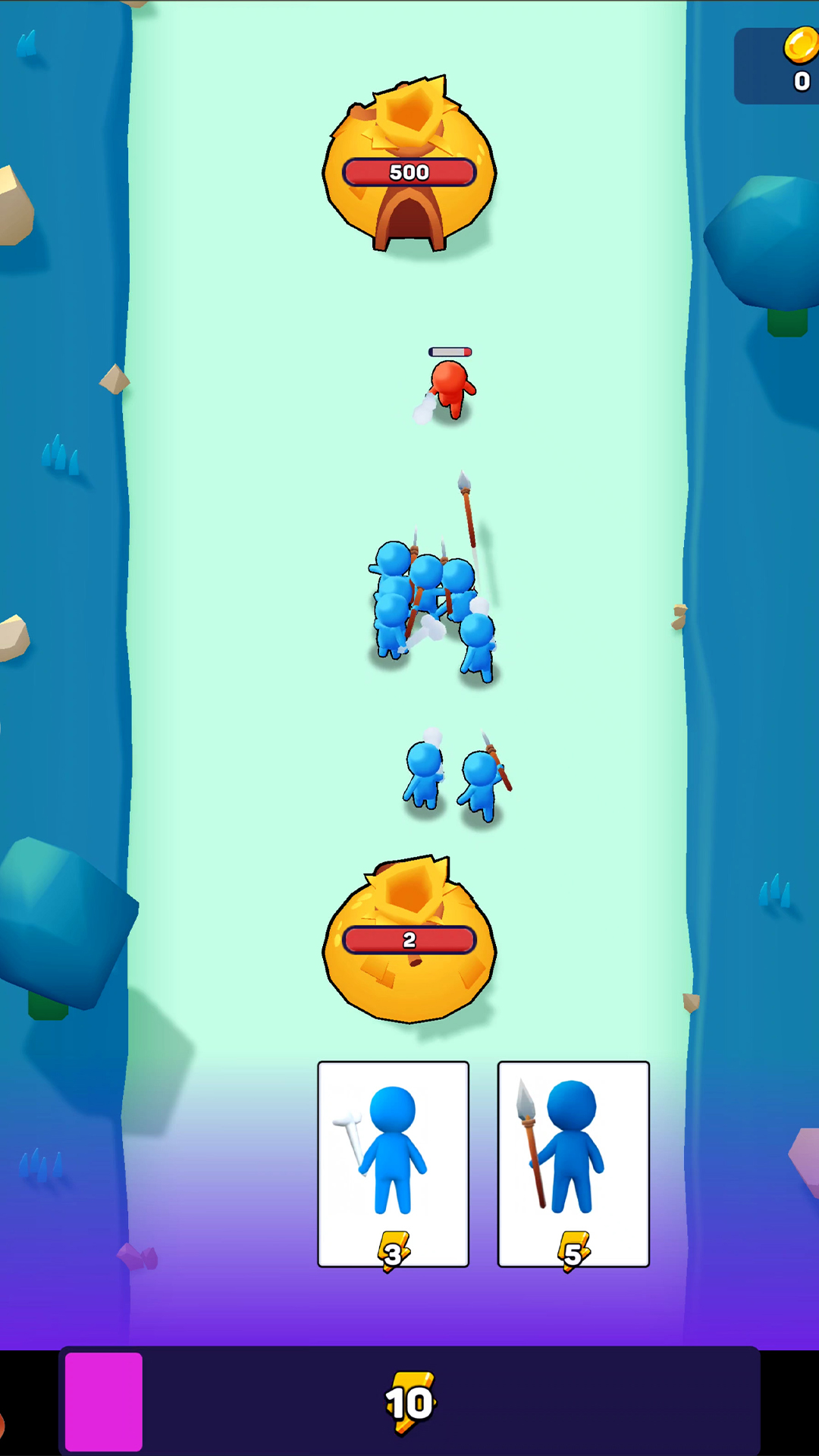 1、通过消耗战斗中自动增长的能量点,从召唤池中拖拽出不同职业的火柴人单位部署到战场。