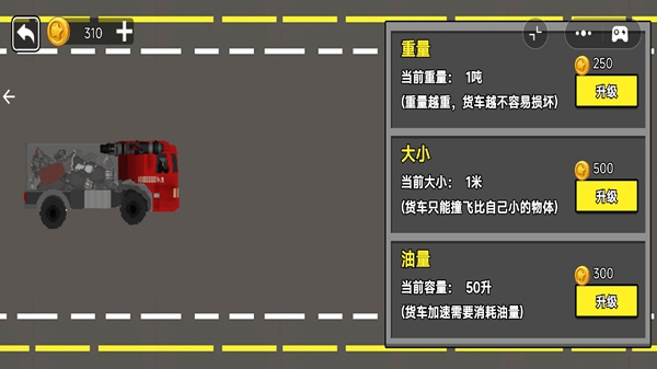 2、卡车拥有可升级的属性系统,如油量和载重,升级后能显著提升游戏表现。