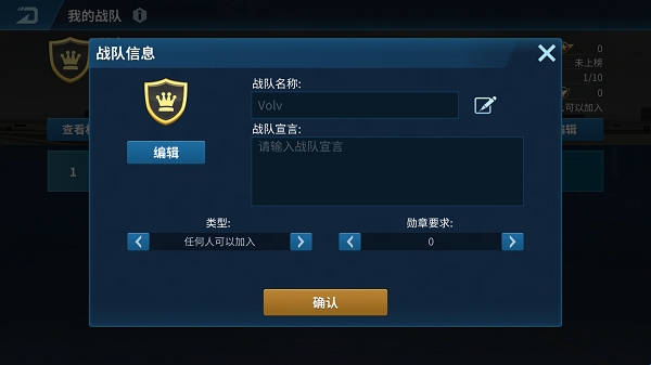 在“我的战队”界面,只有指挥官和副指挥官可以进行战队编辑,修改战队名字,战队图标、类型和勋章要求。修改战队名称需要消耗战队改名卡。