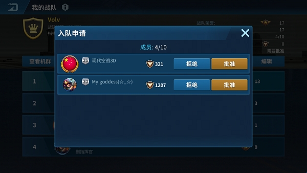当战队类型改为“需要批准才能加入”时,在入队申请列表可以看到申请加入战队人员的列表信息。只有指挥官和副指挥官可以进行入队审批。管理者可以根据申请者的实力和等级,同意或拒绝申请者入队。