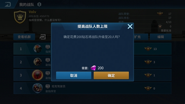 当战队人数达到上限,无法继续增加新成员时该怎么办呢?我们可以选择扩充战队来增加成员空位。只有指挥官和副指挥官可以进行战队扩充。将战队容量由10人扩充到20人需要消耗200钻石。