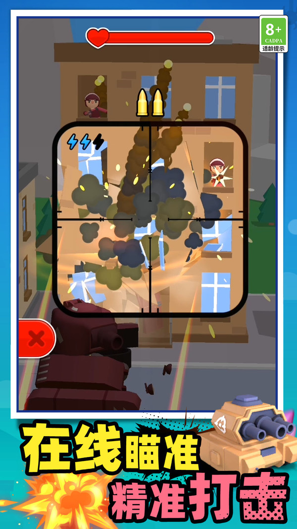 指尖对决游戏:开着坦克前往各个战场,使用坦克自带的武器攻击敌人,打开坦克的瞄准镜,可以对超远距离的敌人造成伤害。作战的时候也要小心敌人的坦克,通过机动走位躲避敌人的炮弹,找到掩体之后可以对敌人发起反击,先摧毁敌人的坦克和飞机,再消灭躲在楼房里面的敌人!