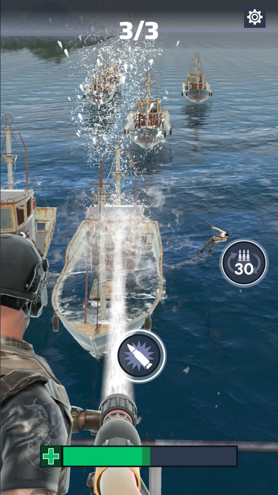 航海现代战争手游的战斗主要分为三个阶段,第一阶段是乘坐直升机对付海上敌人,第二阶段是登岛消灭陆地上面的敌人,第三阶段在轮船上面使用高压水枪对付敌人的舰艇!玩家必须在每个阶段都取得胜利,才能顺利进入下一个阶段的战斗哦!