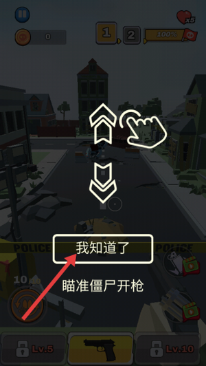 2、在教程提示页点击我知道了,了解如何瞄准僵尸并进行射击操作。