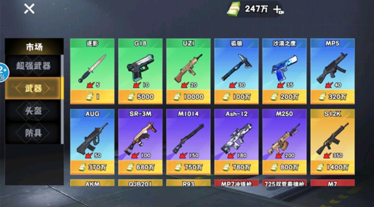 2、在进入地图前可以点击市场来购买不同的装备,市场里可以购买武器、头盔和护甲。