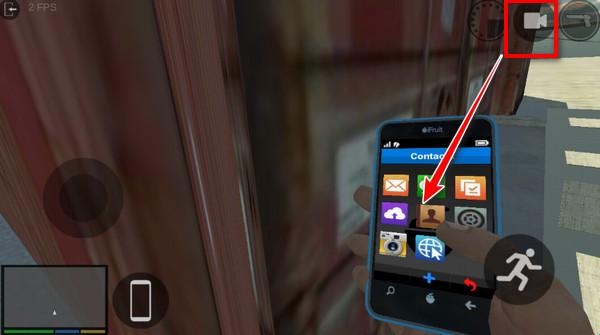 2、建议切换到第一人称更方便看手机菜单,我们点击这里手机中的通讯录图标;