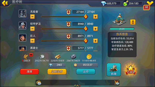 玩家可以花费相对训练新的士兵少量的资源治疗存在于医疗所的部队,医疗所最高可升级至25级,提升所登记或建造更多的医疗所可增加伤病的容量。