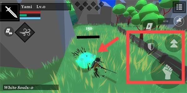 2、进入游戏场景,熟悉界面元素,使用右侧技能,需要小心探险,寻找装备。