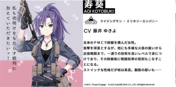 在北美 PMC累积经验的女性。虽说擅长狙击,但其实从各种热兵器到近距离格斗都拥有高水平的技术,也因此会借着这些经验负责战斗指导的工作。性格坦率直白,是个思考单纯的人