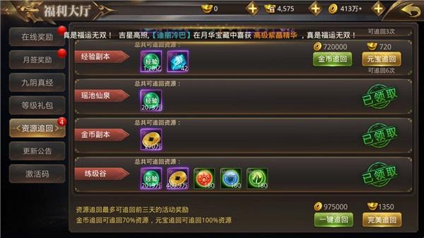 如果你前一天有活动忘了完全,第二天上线后记得使用游戏中的资源追回功能,可以100%获得前一天损失的活动资源,不仅是经验,各种材料道具也是全数返还,可以说是个非常良心的设定!当然如果你不舍得花费元宝的话,也可以选择用金币追回70%的资源,损失也不算太大。