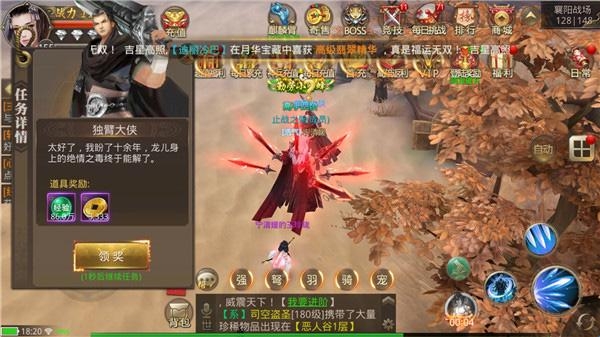升到一定等级,还能参加各类PVP战场和活动。目前游戏内开放的活动包括机缘宝矿、瑶池仙泉、心魔幻境、据点争夺、世界BOSS等活动,挑战副本、组队副本、离线竞技、武林争霸等战场。参加这些活动,不仅经验丰厚,还能够赢取英雄令、声望值、荣誉值等奖励,兑换技能书和进阶道具!